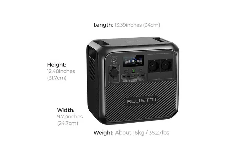 BLUETTI hat den AC180 mit einer dauerhaften Ausgangsleistung von 1.800 W und einer Kapazität von 1.152 Wh ausgestattet, damit er die meisten Geräte mit Strom versorgen kann. Er verfügt außerdem über den Powerlifting-Modus. Dieser liefert eine Ausgangsleistung von 2.700 W, sodass leistungsstarke Geräte mühelos betrieben werden können. Sie sind nicht mehr auf eine Verbindung zum Stromnetz angewiesen oder können unterwegs laden, da die Powerstation über viele Ausgänge verfügt, darunter ein AC-Anschluss, ein USB-A-Anschluss, ein USB-C-Anschluss, ein 12-V-DC-Anschluss sowie ein Induktionsladegerät.